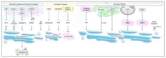 Golgi stress in each neuropathy. In Alzheimer’s disease and Parkinson’s disease, Syx5 induces Golgi fragmentation and cell death via βAPP and Caspase–3. The inhibition of HSP20 phosphorylation and accumulation of Aβ and NETs cause Golgi fragmentation. It has been reported that in Huntington’s disease, increased intracellular cystine/cysteine inhibits ATF4 and suppresses hydrogen sulfide production so that Golgi stress does not occur; however, there are scattered reports to the contrary [33,55]. In FTD/ALS, the accumulation of CHMP2B mutants in the Golgi activates Arf4 and causes Golgi fragmentation. The accumulation of TDP–43 in SOD1 and the ER and changes in the localization of COP I and COP II by FUS and CCNF also cause Golgi fragmentation. APP, amyloid precursor protein; BACE1, beta–site APP cleaving enzyme 1; NET, neurofibrillary tangle; mHtt, mutant huntingtin; CHMP2B, charged multivesicular body protein 2B; SOD, superoxide dismutase 1; TDP–43, TAR DNA binding protein 43; FUS, fused in sarcoma; CCNF, Cyclin F; OPTN, optineurin gene.