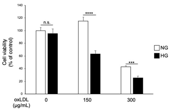 In this study, cells were treated with 5 or 25 mM of glucose (equivalent to 90 or 450 mg/dL), which corresponds to normal physiological levels or uncontrolled diabetes, diagnosed as severe diabetic ketoacidosis (>250 mg/dL) and hyperosmolar hyperglycaemic state (>600 mg/dL) []. The plasma oxLDL level in subjects with metabolic syndrome has been reported to be 1.45 ± 0.82 mg/dL (equivalent to 14.5 μg/mL), which is lower than the concentration used in our experiments []. However, the local physiological concentration in patients with atherosclerosis reached nearly 70 times higher than plasma levels []. In our experiments, we used 150 and 300 μg/mL of oxLDL, which also covers physiologically possible concentrations in vivo as described previously [].