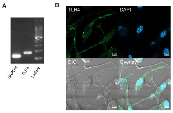 Expression and localisation of TLR4 in IMS32 cells. (A) TLR4 mRNA expression in IMS32 cells. (B) IMS32 cells were grown on coverslips for 24 h. The cells were fixed with 4% paraformaldehyde, permeabilised, and immunostained with anti-TLR4 antibody (green). The nuclei were stained with DAPI (blue). DIC, differential interference contrast scale bar, 5 μm.
