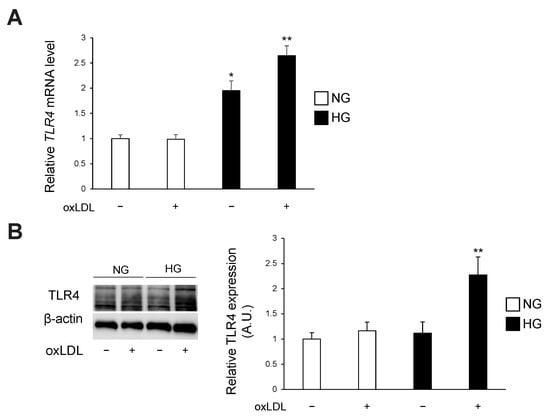 3.2. Hyperglycaemia and oxLDL Treatment Upregulate TLR4 Gene and Protein Expression