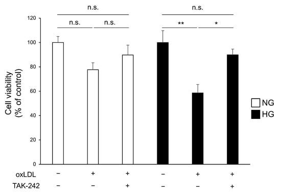 We tested our hypothesis that the increase in cell death induced by the combination of hyperglycaemia and oxLDL treatment was due to the hyperactivation of the TLR4 pathway. The cells were treated with oxLDL under NG or HG conditions with or without pre-treatment with TAK-242, a selective TLR4 inhibitor, followed by an MTT cell viability assay. Under NG conditions, oxLDL treatment did not significantly induce cell death, and TAK-242 pre-treatment had no notable effect (Figure 4, NG oxLDL(−) TAK-242(−), NG oxLDL(+) TAK-242(−), NG oxLDL(+) TAK-242(+); 100 ± 4.9, 77.7 ± 5.6, 89.7 ± 8.0). In contrast, TAK-242 pre-treatment significantly attenuated oxLDL-dependent cell death under HG conditions (Figure 4, HG oxLDL(−) TAK-242(−), HG oxLDL(+) TAK-242(−), HG oxLDL(+) TAK-242(+); 96.6 ± 9.7, 56.7 ± 6.9, 86.8 ± 4.7).