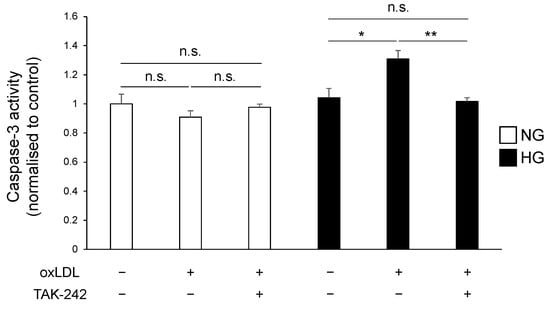 TLR4 inhibition suppressed caspase-3-dependent apoptosis. IMS32 cells were pre-treated with or without TAK-242 (100 nM) for 2 h and cultured in either normo- or hyperglycaemic conditions in the presence or absence of oxLDL (150 μg/mL) for 3 h. Caspase-3 activity was measured. * p < 0.05, ** p < 0.01, comparisons between indicated groups. n.s., not significant; IMS32, immortalised mouse Schwann; TLR4, toll-like receptor 4.