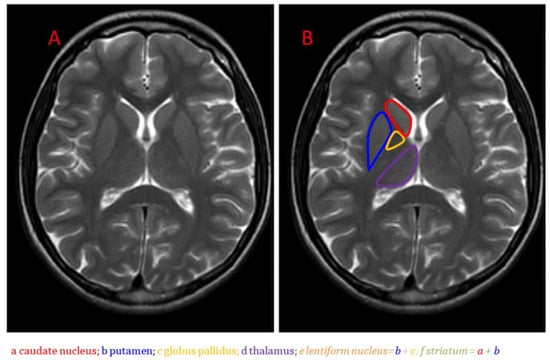 Anatomical MRI of the basal ganglia in the axial plane on T2-weighted imaging: (A) Unlabeled image; (B) Image with caudate nucleus, putamen, globus pallidus, and thalamus labeled [7].