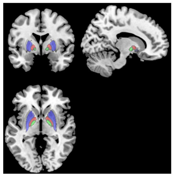 T1 MRI showing the putamen (red), pallidum (cyan), and thalamus (green), which all had smaller volumes in subjects > 6 months post-infection than subjects < 6 months post-infection [23].