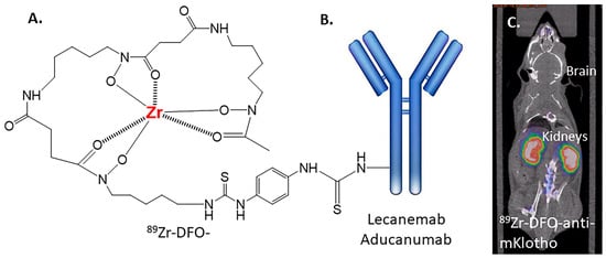 - Lau, W.L.; Liang, C.; Liu, H.; Singh, K.; Mukherjee, J. Development of Zirconium-89 PET for in vivo imaging of alpha-Klotho. Am. J. Nucl. Med. Mol. Imaging 2020, 10, 95–105. [Google Scholar]