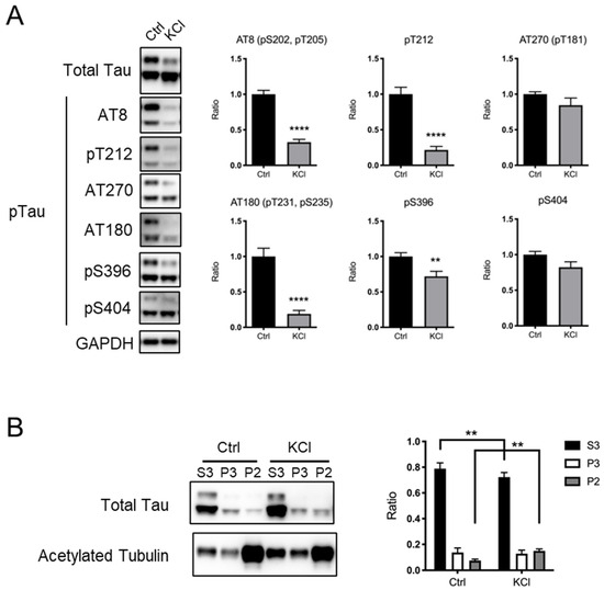 KCl-induced depolarization has often been used as a model to investigate the effect of neuronal activity in culture [8,9,10,11,12,13,14,15]. To examine whether the phosphorylation status of the tau protein is affected by KCl-induced depolarization, we generated a mouse hippocampal neuron primary culture and performed KCl stimulation. As a KCl-induced subcellular Ca2+ level increase was reported to last for up to 4 h [16], we harvested neurons 4 h after the addition of 50 mM KCl to the culture and examined the levels of tau protein phosphorylation at several sites, including the AT270 site (T181), AT8 sites (S202, T205), T212, AT180 sites (T231, S235), S396, and S404. We found that phosphorylation at AT8 sites, T212, AT180 sites, and S396 was significantly decreased by KCl treatment, while phosphorylation at the AT270 site and S404 was unchanged (Figure 1A). The levels of total tau protein were comparable between the Ctrl and KCl-treated neurons (Figure 1A). Previous reports suggested that phosphorylated tau protein is dissociated from microtubules [4,5,6,7,18,20,22]. To investigate whether KCl-induced tau protein dephosphorylation affects its association with microtubules, we performed microtubule fractionation using primary cortical neurons [25]. We found that KCl treatment increased the tau protein in stable microtubule fractions (P2, indicated by the presence of acetylated tubulin) and decreased the tau protein in free tubulin fractions (S3) (Figure 1B). These results suggest that KCl treatment causes the dephosphorylation of tau proteins at some key residues to increase its binding to stable microtubules.
