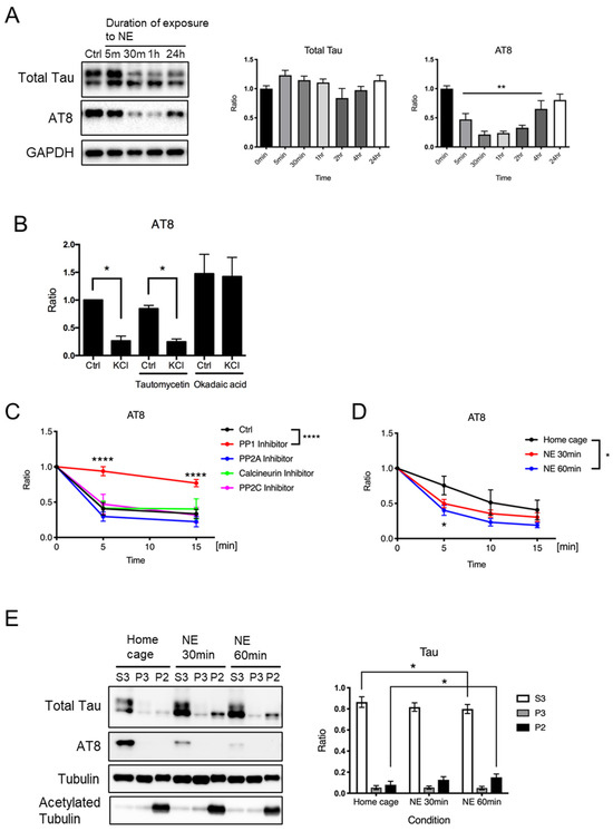 Exposure to a novel environment causes neuronal tau protein dephosphorylation, leading to its binding to microtubules in vivo. (A) Representative immunoblots (left) and the quantified expression levels normalized to the control (right) showing expression levels of tau protein and phosphorylated tau protein at AT8 recognition sites in hippocampal tissues obtained from wild-type mouse brains at indicated time after novel environment exposure. Statistical analysis was performed using one-way ANOVA followed by Dunnett’s multiple comparison test. The values show mean ± S.E.M. (n = 6~11). (B) A bar graph showing phosphorylated tau expression levels after KCl-induced neuronal depolarization in the presence of indicated phosphatase inhibitors in cultured neurons detected by AT8 antibody using immunoblot analysis. Expression levels are shown relative to the level of unstimulated control. The values are shown as mean ± S.E.M. (* p < 0.05; n = 3). Statistical analysis was performed using one-way ANOVA followed by Sidak’s multiple comparisons test. (C,D) Phosphatase assay results. In (B), quantified levels of AT8 immunoreactivity were measured by immunoblot analysis in lysates from untreated wild-type mouse brain incubated at 37 °C for indicated time with 1 μM of inhibitors of each phosphatase, i.e., PP1 (tautomycetin), PP2A (fostriecin), Calcineurin (cyclosporin A), or PP2C (sanguinarine chloride), relative to the level at time zero, are shown. In (C), quantified levels of AT8 immunoreactivity were measured by immunoblot analysis in lysates from brains of wild-type mice exposed to a novel environment for 30 min or 60 min, incubated at 37 °C for the indicated time, relative to the level at time zero, are shown. The values are shown as mean ± S.E.M. (n = 3–7). Statistical analysis was performed using two-way ANOVA followed by Dunnet’s multiple comparison test. (E) Mice were exposed to a novel environment for the indicated time, and their hippocampi were subjected to microtubule fractionation. Representative immunoblots (left) and the quantified levels of AT8 immunoreactivity shown as ratios in each fraction (right) are shown. Statistical analysis was performed using two-way ANOVA followed by Tukey’s multiple comparison test. The values show mean ± S.E.M. (n = 6). Tau, tau protein; Ctrl, control; NE, new environment; * indicates p < 0.05, ** indicates p < 0.01, **** indicates p < 0.0001.