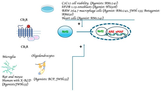 Experimental models demonstrating CB2R-mediated Nfr2 pathway activation. The data from studies investigating the relationship between Nrf2 and cannabinoids via CB2R receptors are compiled in the figure. The receptor’s structure and the Nrf2 pathway have been simplified and schematized to aid in the understanding of the figure (from: [48,52,60,61,77,79,80,81]).