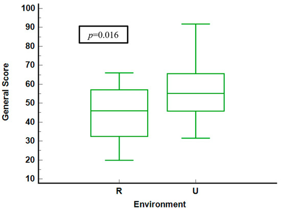 General score stratified by environment. R = rural. U = urban.