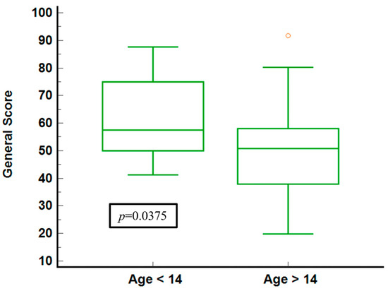 The illustration of general health scores for the age groups (Figure 4) shows that younger individuals (under 14) report higher median scores and a narrower IQR, indicating less variability and generally better-perceived health. In contrast, the older group shows a broader IQR and a lower median score, signifying more significant variability and worse health perceptions. The statistical significance (p = 0.0375) confirms a meaningful difference between the two age groups.