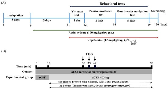 Experimental schedules for rutin hydrate effects. (A) Time schedule for behavioral tests. RH treatments were administered for a total of 15 days. Following pre-treatment, RH and SCO treatments were administered for 10 days for the behavioral tests. Y-maze test, passive avoidance test, and Morris water navigation test were performed for 8days. (B) Time schedule for electrophysiological tests. The organotypic hippocampal slices were treated with 300 µM SCO and RH (1, 10 100 µM) along with aCSF. Each experiment was executed for a total of 90 min and consisted of 30 min of base-line recording of fEPSP at one stimulation per min, 10 min of TBS, and 50 min of post-TBS fEPSP measurements. SCO, scopolamine; RH, rutin hydrate.