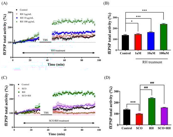 Effect of RH on LTP in the rat hippocampus (n = 5) group. (A) Time course of total fEPSP activity percentage variation induced by TBS during the treatment of RH in the organotypic-cultured hippocampus. (B) Average of fEPSP total activity 30 to 40 min post-TBS during the dose-dependent treatment of RH (1, 10, and 100 μM). Value of 1 μM (* p < 0.05), value of 10 μM (*** p < 0.001), value of 100 μM (*** p < 0.001) vs. a control group. (C) Time course of total fEPSP activity percentage change induced by TBS during the treatment of SCO vs. SCO + RH in the organotypic cultured hippocampus. (D) Average of fEPSP total activity 30–40 min following TBS during the treatment of SCO and SCO + RH. *** p < 0.001 vs. control group, ### p < 0.001 vs. SCO group. Significant values between the pairs of groups examined by one-way ANOVA in SPSS analysis of LSD variance statistically significant difference test. SCO, scopolamine; RH, rutin hydrate.