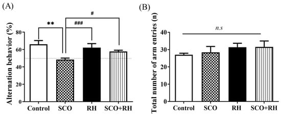 In the Y-maze test, the measured percentage of spontaneous alternation was connected to short-term spatial memory, and rats preferred exploring a new arm rather than returning to the previously visited arm, which is consistent with rodents’ urge to explore new habitats. The findings showed that the proportion of spontaneous alternations varied considerably across groups (Figure 3A). The RH group exhibited a substantial difference, whereas the SCO group showed less alternation behavior than the control group. There were no differences in the total number of arm entries (Figure 3B), demonstrating that the variations in alternation behavior had no confusing effect on locomotor activity for spatial memory.
