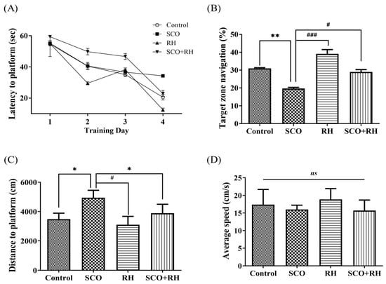The result of RH on long term spatial learning and memory in the MWN task. (A) Escape latency to the concealed platform during 4 days of training. (B) Percentage of time spent in the target zone during the test session. (C) Mean distance to platform in the test session. (D) Average speed during the test session. All the data are presented as mean ± SEM, n = 4, * p < 0.05, ** p < 0.01 vs. control, # p < 0.05, ### p < 0.001 vs. SCO. Note that non-significant (ns) differences were observed. The values are examined by one-way ANOVA in SPSS with post hoc LSD test. SCO, scopolamine; RH, rutin hydrate.