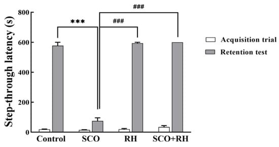 The PA task is an experiment that uses the natural preference of the rat for darkness [59]. The PA test was performed to evaluate short-term learning and memory abilities in rats that were exposed to an inescapable electrical shock upon entering a dark box in this study. The SCO group did not remember about the electric shock of the previous day and entered the dark compartment again with little latency [60]. However, the RH group considerably slowed the step-through latency. RH administration substantially mitigated the reduction of the step-through latency caused by SCO. These findings suggest that RH inhibited short-term learning and memory deficits (Figure 5). In all the behavioral tests (Y-maze, PA, and MWN), RH effectively reduced learning and memory dysfunction induced by SCO.