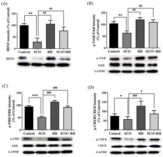 Effect of RH on the BDNF, TrkB, ERK, and CREB protein expression in the SCO-induced rat hippocampus. (A) Band quantification of BDNF/GAPDH ratios. (B) Band quantification of p-TrkB/TrkB/GAPDH ratios, (C) Band quantification of p-ERK/ERK/GAPDH ratios, (D) Band quantification of p-CREB/CREB/GAPDH ratios. Final data are presented when n = 5, mean ± SEM, * p < 0.05, ** p < 0.01, *** p < 0.001 vs. control, # p < 0.05, ## p < 0.01, ### p < 0.001 vs. SCO group with the analysis performed using one-way ANOVA honest significant difference LSD test between groups. SCO, scopolamine; RH, rutin hydrate.