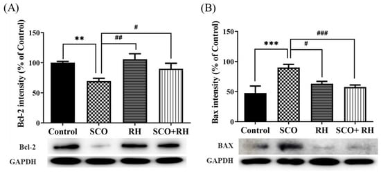Protein levels related to neuronal apoptosis in the hippocampus of SCO-induced SD rats were measured using Western blot analysis. The results of all the groups were moderate compared with those of the control group. The ratios of Bax/glyceraldehyde 3-phosphate dehydrogenase (GAPDH) and Bcl2/GAPDH showed significant differences in all the groups compared to the SCO group. For the apoptosis inhibitory protein Bcl2, RH was used, and a significant difference was observed among the handling groups [F (3, 16) = 5.267, p < 0.05, Figure 7A]. In association with the control group, Bcl2 levels were reduced in the SCO group (p < 0.01). Nevertheless, Bcl2 levels in the RH treated group (p < 0.05) were notably higher than those in the SCO group. An obvious change was observed in the hippocampal Bax appearance among the groups [F(3, 16) = 6.796, p < 0.01, Figure 7B]. The apoptosis-promoting protein Bax was significantly upregulated in the SCO group actively compared to the control group (p < 0.01), whereas the Bax levels in the RH (p < 0.05) and SCO + RH (p < 0.05) treatment group decreased in comparison with the SCO group. These results indicated that RH treatment could prevent SCO-induced apoptotic changes.