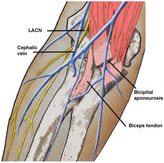 The lateral antebrachial cutaneous nerve (LACN) is the distal sensory termination of the musculocutaneous nerve in the lateral aspect of the forearm [1,2,3,4,5]. After the musculocutaneous nerve gives off its muscular branches to the biceps brachii and brachialis muscles, it continues as the LACN. The LACN passes alongside the biceps brachii tendon and deep to the cephalic vein, after which it descends down the radial aspect of the forearm to the wrist where it is anterior to the radial artery. The LACN terminates at the base of the thenar eminence. The LACN is solely a sensory nerve and innervates the skin of the anterior half and radial posterior quarter of the forearm. Due to its anatomical proximity to the biceps brachii tendon, lateral epicondyle, antebrachial vein, and cephalic vein (Figure 1), the LACN is prone to iatrogenic injuries during repair of the biceps tendon [4,6,7,8,9,10], phlebotomy [4,11,12,13,14,15], prolonged use of retractors by surgical assistants [16], positional pressure during prolonged surgery [17], and steroid injection at the lateral epicondyle [18]. Entrapment neuropathy of the LACN may occur at the lateral margin of the biceps tendon/bicipital aponeurosis or at the site of emergence of the nerve through the deep fascia [1,2,3,4,5,16,19,20,21,22,23,24].