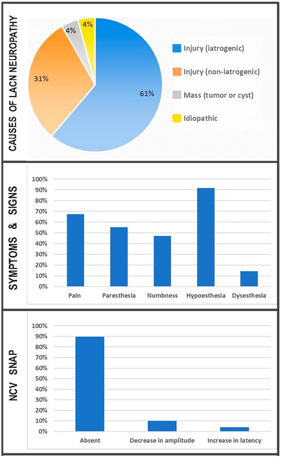 Figure 3 summarizes the causes, symptoms, signs, and NCV SNAP findings associated with LACN neuropathy in our study.