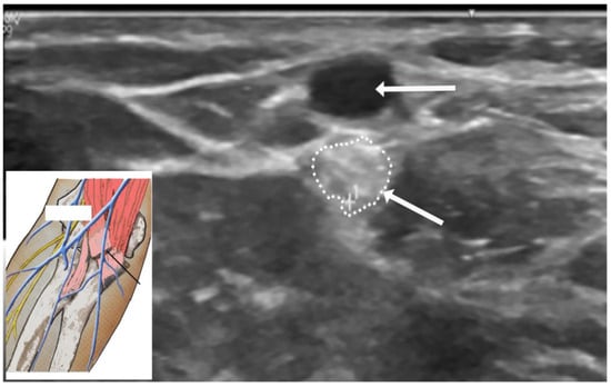 US studies may assist in the diagnostic evaluation of LACN neuropathy by differentiating various conditions with symptoms involving the upper arm, elbow, forearm, and wrist [35]. Ultrasound (US) plays an important role in the localization and determination of the etiology of LACN neuropathy. In Chiavaras and colleagues’ study of USs of the LACN with MRI and anatomic correlation in 13 patients with LACN neuropathy, the symptomatic LACN demonstrated fusiform enlargement, increased echogenicity, and loss of the normal fascicular echotexture [35]. The mean cross-sectional area of the symptomatic LACN was 12.0 mm2 compared to 3.3 mm2 at the same level in the contralateral normal side. While only seven patients in our series underwent an US study, it was valuable in providing details of the masses in the upper extremity compressing the LACN. Figure 5 depicts the US study involving injury to the LACN from phlebotomy.