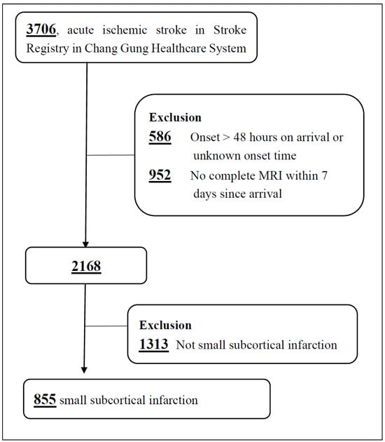 A total of 3706 stroke patients were identified from the Stroke Registry in Chang Gung Healthcare System (SRICHS) at the Jiayi branch between 2016 and 2021 (Figure 1). Out of these, 586 patients whose stroke onset occurred more than 48 h before arrival, as well as 952 patients who did not undergo a complete MRI study, were excluded from the analysis. This left 2168 patients, of whom 855 had acute SSIs.