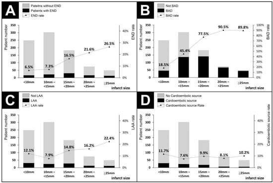 Number and percentage of patients with early neurological deterioration, branch atheromatous disease, large-artery atherosclerosis, and cardioembolism across different infarct sizes. (A) Early neurological deterioration (END). (B) Branch atheromatous disease (BAD). (C) Large-artery atherosclerosis (LAA). (D) Cardioembolism.