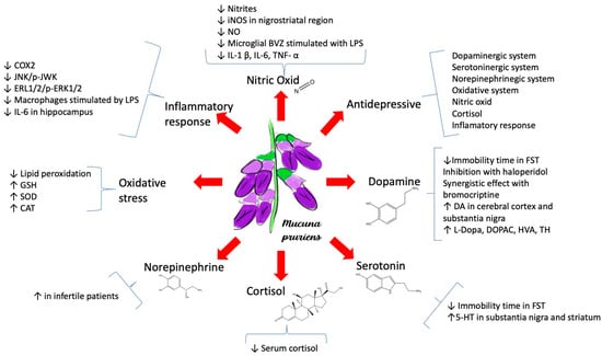 Among the pharmacological properties of the plant are: (1) anti-inflammatory capacity [24]; (2) modulation of the dopaminergic system [21]; (3) modulation of the serotonergic and noradrenergic systems [25]; (4) antioxidant effect [26]; and (5) neuroendocrine modulation [27]. These pharmacological properties are closely related to the antidepressant effect of the M. pruriens plant, which is described in more detail below and in Figure 2.