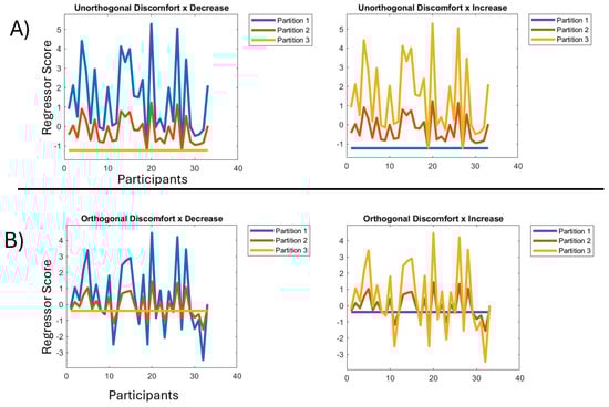 (A) Left: regressor for discomfort by decrease across the blocks/partitions before orthogonalization. X axis represents participants, Y axis represents the scores of each participant. Right: regressor for discomfort by increase across the blocks/partitions before orthogonalization. X axis represents participants, Y axis represents the scores of each participant. (B) Left: regressor for discomfort by decrease across the blocks/partitions after orthogonalization. X axis represents participants, Y axis represents the scores of each participant. Right: regressor for discomfort by increase across the blocks/partitions after orthogonalization. X axis represents participants, Y axis represents the scores of each participant.