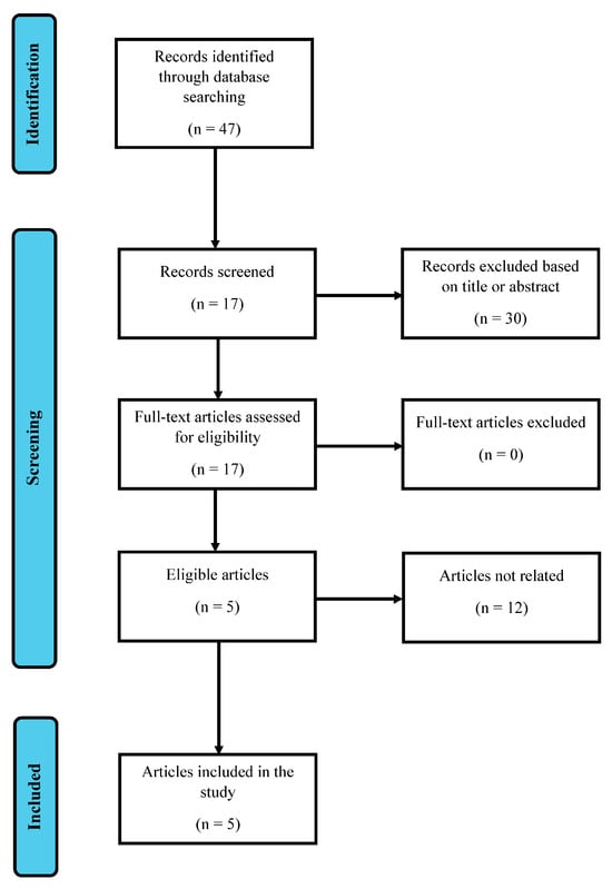 A total of forty-six manuscripts were identified in the first phase or research, of which thirty were subsequently excluded based on the title and abstract. Further twelve articles were excluded based on the non-related topic covered. No articles were excluded due to the impossibility of either retrieving the full-text work or the language used was not English, leaving a total of five articles meeting the inclusion criteria. Included articles are reported in Table 1; the flowchart is reported in Figure 1.