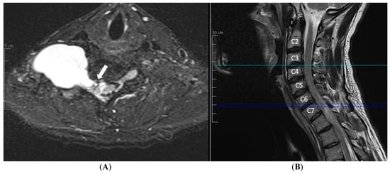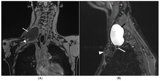 (A) T1-VIBE-weighted coronal-view MRI of right brachial plexus. A voluminous pseudomeningocele is shown (white arrow) with the highest point starting at C6 low endplate. The pseudomeningocele covers almost the entirety of the right brachial plexus and comes in contact with the subclavian artery (white arrowhead). (B) T2-STIR-weighted sagittal-view MRI. It is possible to appreciate the relationship of the pseudomeningocele (black arrow) with the subclavian artery (white arrow) and its localization in comparison with the clavicle (white arrowhead).