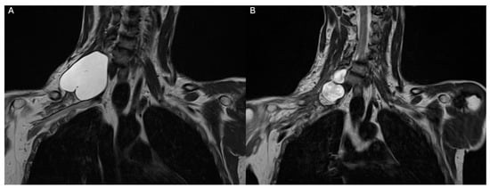 - Gasparotti, R.; Ferraresi, S.; Pinelli, L.; Crispino, M.; Pavia, M.; Bonetti, M.; Garozzo, D.; Manara, O.; Chiesa, A. Three-dimensional MR myelography of traumatic injuries of the brachial plexus. Am. J. Neuroradiol. 1997, 18, 1733–1742. [Google Scholar] [PubMed] [PubMed Central]