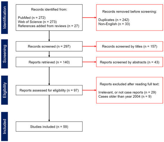 PRISMA plot for selecting case reports (2004–2024) reviewed in the current perspective.