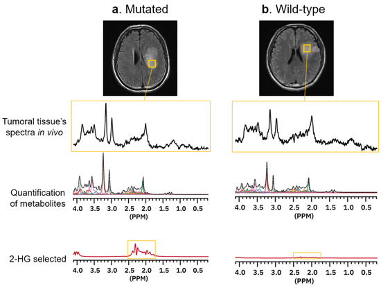 A normalized Cho/NAA ratio is a particularly informative marker for brain tumor diagnosis, signaling increased membrane turnover alongside reduced cell viability [92,96,99,100]. Additionally, 1H-MRS has unique sensitivity to 2-hydroxyglutarate (2-HG), a metabolite elevated exclusively in tumor cells with the oncogenic isocitrate dehydrogenase (IDH1) mutation [101,102], frequently found in gliomas [103] and secondary glioblastomas [104]. Since IDH1 mutation is associated with prolonged survival and better response to chemotherapy [105,106], 1H-MRS is highly informative for these subtypes of brain tumors [107,108]. Figure 2 demonstrates how 1H-MRS identifies tumor mass that is positive for the IDH1 mutation by quantifying 2-HG.