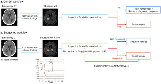 Suggested workflow compared to the current approach for utilizing MRS to detect tumor masses obscured by hemorrhage. (a) In current clinical practice, when emergency CT scans reveal intracerebral hemorrhagic lesions, structural MRI is often considered as a follow-up after clinical correlation. However, treatment decisions may rely heavily on imaging findings, potentially overlooking underlying neoplastic conditions. (b) By integrating structural MRI with MRS for cases of suspected hemorrhagic lesions observed on CT, clinicians can obtain both structural details and a biochemical profile of the lesion. We propose three volumes of interest: (1) normal tissue often positioned contralateral to the lesion (cyan), (2) suspected tumor mass (white), and (3) perilesional area (red). If the suspected lesion exhibits a spectral profile consistent with that of neoplasms and significantly differs from the profiles of normal and perilesional regions, clinicians may proceed with interventions specifically targeting the tumor mass. This suggested workflow may enhance diagnostic sensitivity and accuracy, especially when the neoplastic mass is small or obscured by hemorrhage. MRS can also provide information regarding the tumor type, which could inform biopsy strategies and further clinical decisions.