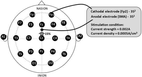 The anode electrode was positioned in front of Cz, at 15% of the nasion-inion distance from the naso-inion measurement at point Cz on the midline, following the international 10−20 system of electroencephalogram, corresponding to the Supplementary Motor Area, and the cathode electrode in the Fp2 region, right supraorbital (Figure 1). All electrode placement procedures were performed in the sham stimulation, but the stimulator was turned on for only 30 s. Hence, the participants experienced the initial sensation of the procedure, but did not receive any stimulation for the remaining time. This procedure is a valid form of control in transcranial direct current-stimulation studies [42,43]. A current of 2 mA (current strength = 0.002 A; current density = 0.0005 A/cm3) was delivered over the Supplementary Motor Area for twenty minutes while the participant underwent the exercise protocol. The ramp-up to reach the stipulated intensity of 2 mA was 30 s, as was the ramp-down.