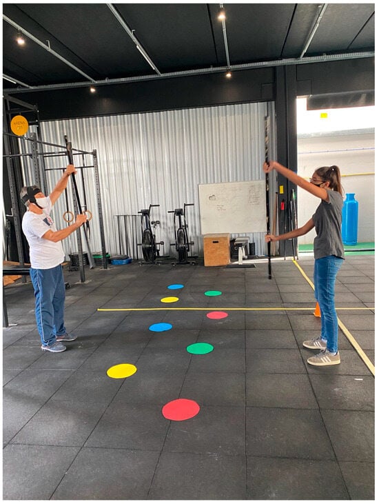 The exercise protocol was based on the Agility Boot Camp (ABC) program developed by researchers at Oregon Health and Sciences University, USA. This program emphasizes training skills such as walking speed, balance, and the relationship between mobility and cognition. Previous research has demonstrated favorable outcomes in variables like mobility, gait speed, balance, and stride length [49]. Although the original studies that described the exercise protocol referred to it as high intensity, they did not define or report how intensity was measured. In our case, we instructed participants to perform the exercises at a self-perceived moderate intensity. However, no objective measures of exercise intensity were recorded. The regimen consisted of five weekly sessions, each lasting 20 min, spanning two consecutive weeks. The participants were familiarized with all exercises before the study, and the chosen tasks aimed to challenge the subjects’ motor and cognitive capacities.