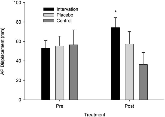 Anterior–posterior displacement across groups pre- and post-treatment. An asterisk (*) indicates a significant difference from pre- to post-treatment for the intervention group (p = 0.027).