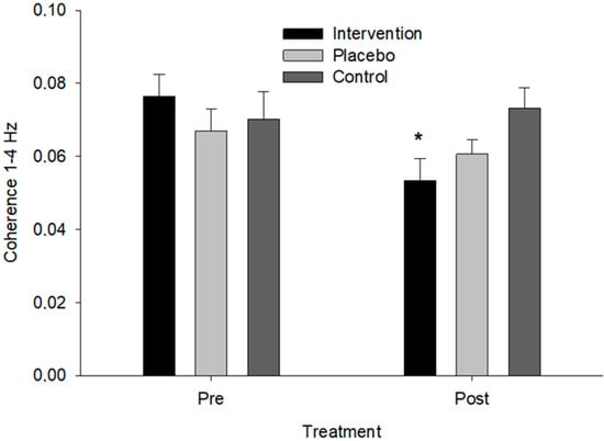 Coherence between force and acceleration in the 1–4 Hz frequency band across groups. An asterisk (*) indicates a significant difference from pre- to post-treatment for the intervention group (p = 0.007).
