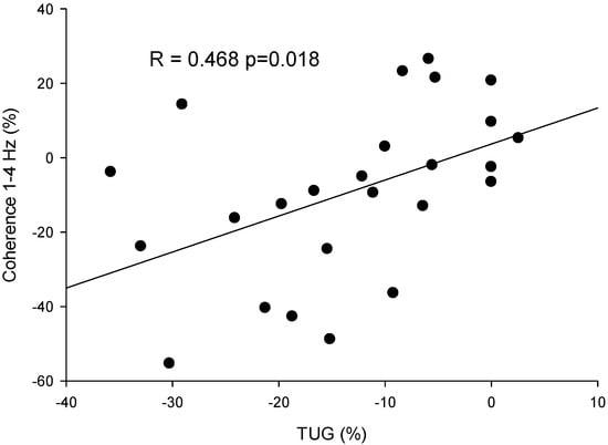 The correlation analyses indicated that the changes in TUG from post- to pre-treatment were significantly positively correlated with the changes in coherence (R = 0.468, p = 0.018), indicating that increased mobility was associated with the decoupling of tremor and force control (Figure 6).