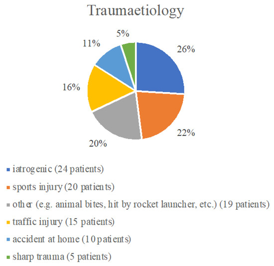 The genesis of the evaluated lesions is shown in Figure 1. In 19 (20%) cases, the trauma was not divisible into any of the groups and included etiologies such as animal bites or a rocket launcher.