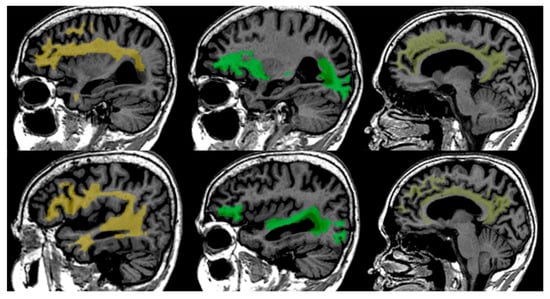 - Dalboni da Rocha, J.L.; Bramati, I.; Coutinho, G.; Tovar Moll, F.; Sitaram, R. Fractional Anisotropy changes in Parahippocampal Cingulum due to Alzheimer’s Disease. Sci. Rep. 2020, 10, 2660. [Google Scholar] [CrossRef]