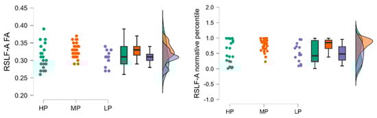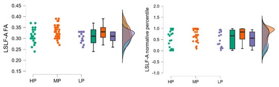 The raincloud plot (Figure 2) visualizes the distribution of LSLF-A FA values across the HP, MP, and LP groups, highlighting the MP group showing higher median FA values compared to the HP and LP groups.