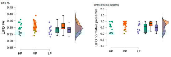 Dunn’s post hoc tests were performed to identify specific group differences. For LIFO FA values, there was a significant difference between the HP and MP groups (z = −2.209, p = 0.027) and between the MP and LP groups (z = 2.315, p = 0.021). No significant differences were found between the HP and LP groups (z = 0.355, p = 0.723).