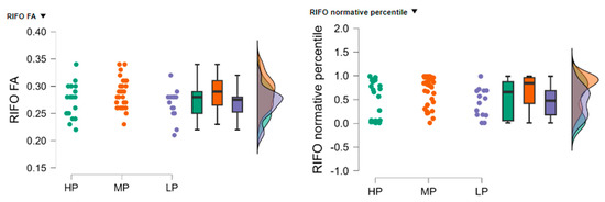 Dunn’s post hoc tests were performed to identify specific group differences. For RIFO FA values, there was a significant difference between the HP and MP groups (z = −2.102, p = 0.037) and between the MP and LP groups (z = 2.379, p = 0.017). No significant differences were found between the HP and LP groups (z = 0.499, p = 0.618).