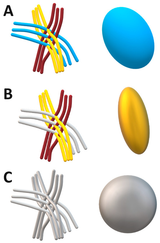 Concept of fractional anisotropy (FA) and its implications for white matter integrity analysis using FA values. (A)—three nerve bundles (blue, brown, yellow) representing moderate FA value, where ellipsoid would be elongated, but not as much as in panel (B), signifying moderate FA values. This indicates that water molecules predominantly diffuse along the direction of the fibers, but with some degree of diffusion in other directions. (B)—two nerve bundles (brown and yellow) intact, grey nerve bundle damaged, resulting in increased isotropic diffusion and higher FA value. (C)—all nerve bundles are depicted in grey, indicating significant loss of organization and alignment, low FA value, representing severe white matter damage and disorganization, typically associated with significant white matter damage and advanced neurodegenerative conditions.