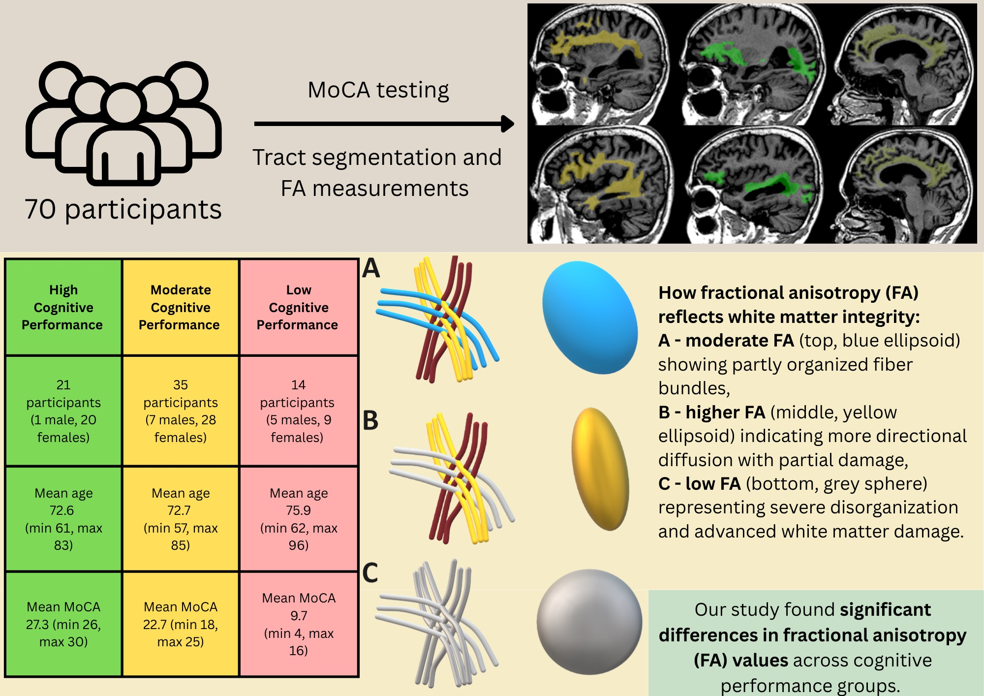 Our findings support FA as a sensitive marker of white matter integrity related to cognitive function, but they also underscore the limitations of relying on FA alone. Variability across tracts and performance groups suggests that FA must be interpreted within a multimodal framework that includes complementary diffusion metrics and macrostructural measures. Such integration may provide a more comprehensive view of early neurodegenerative changes and improve the reliability of diffusion imaging biomarkers.