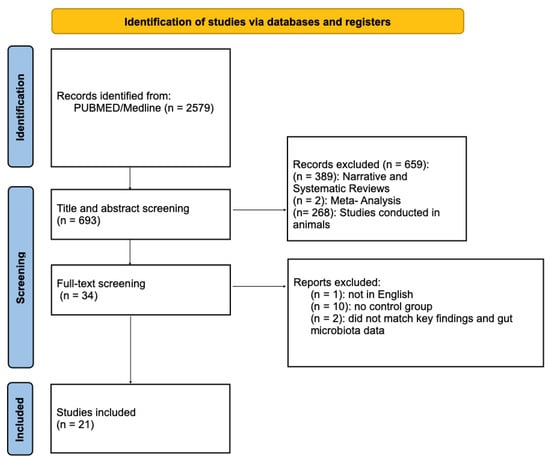 A total of 21 studies exploring the relationship between gut microbiota and cognitive function in adults were included. The study selection process is in the PRISMA flow diagram (Figure 1). The designs comprised 1 randomized controlled trial and 20 cross-sectional observational studies, with sample sizes ranging from 22 to 302 participants. Populations included individuals with MCI and AD. The control group consisted of cognitively normal adults. Some of the included studies also reported participants with subjective cognitive decline (SCD). However, SCD was not used as a search keyword, inclusion criterion, or outcome of this review. It is presented only descriptively in Table 1, where applicable. Details on the bacterial taxa altered in MCI and AD across the 21 included studies are also presented in Table 1 [13,14,15,16,17,18,19,20,21,22,23,24,25,26,27,28,29,30,31,32,33]. This summarized the most frequent microbial changes and their association with cognitive outcomes.