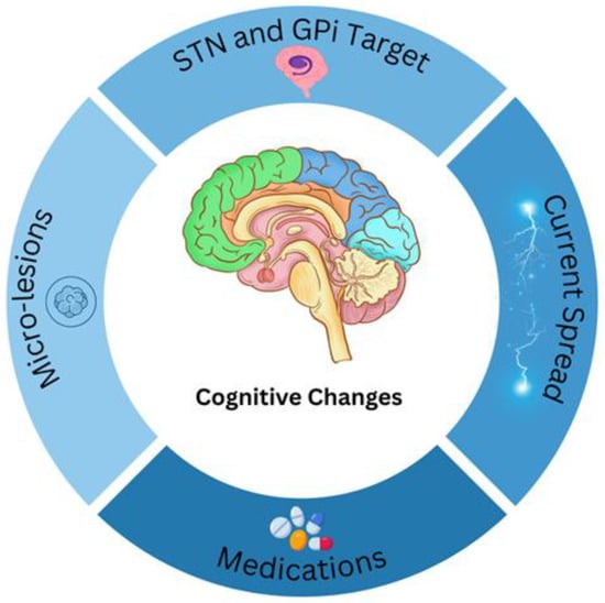 Cognitive changes may arise from numerous factors, and several possible contributors are illustrated here. These include: alterations in medication dosage, unintended current spread to adjacent areas (e.g., GPi stimulation affecting the internal capsule), the specific brain target used for therapy, and micro-lesion effects.