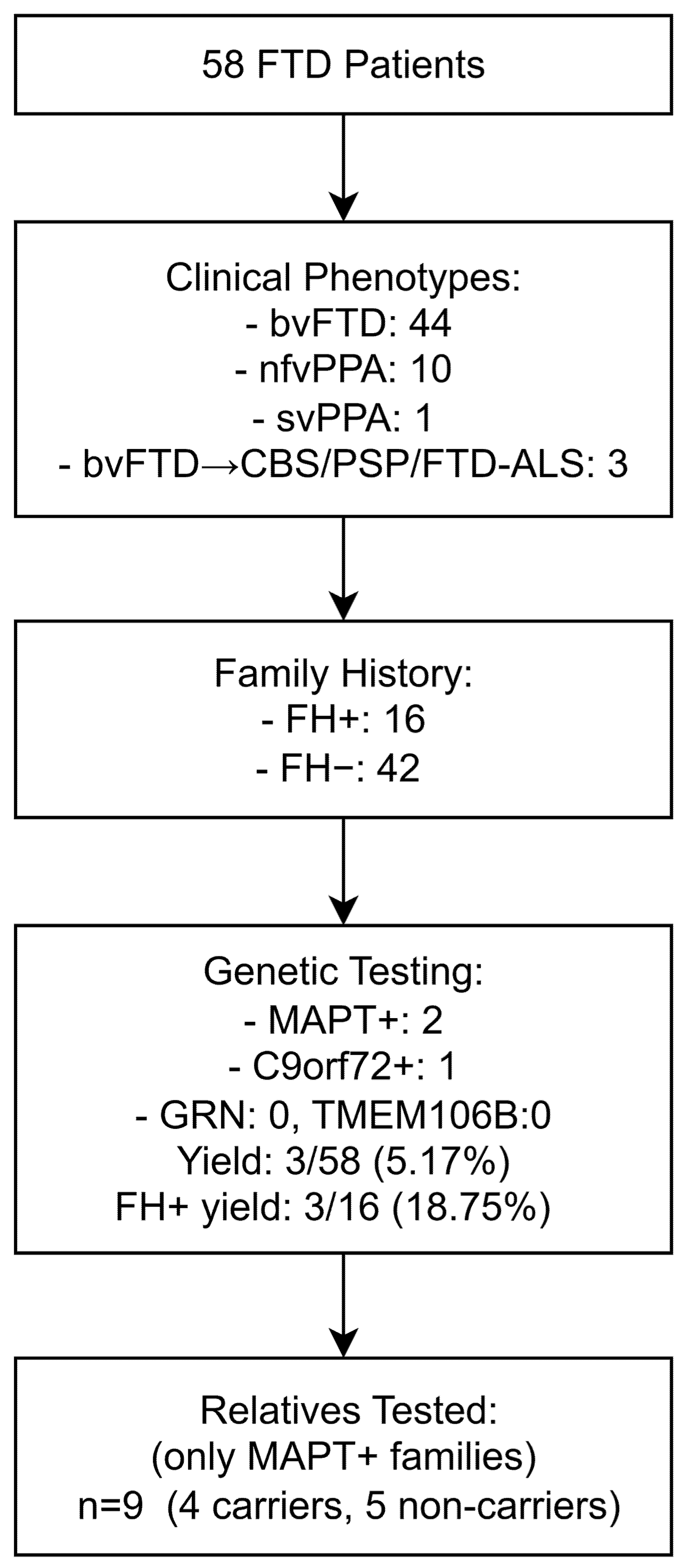 Clinical phenotypes | bvFTD: 44 (75.87%) nfvPPA: 10 (17.25%) svPPA: 1 (1.72%) CBS: 1 (1.72%) PSP: 1 (1.72%) FTD-ALS: 1 (1.72%) |