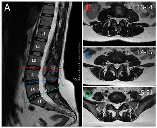 Magnetic Resonance Imaging (MRI) of the lumbar spine. (A) T2-weighted sagittal spine magnetic resonance imaging (MRI)showing degenerative changes in the lumbar spine with multilevel bulging of the intervertebral discs, osteochondrosis. Horizontal lines indicate the corresponding levels in the axial views. (B–D) T2-weighted axial spine MRI at different levels presenting the degenerative changes and intervertebral disc protrusions L3–L4, L4–L5 and L5–S1.